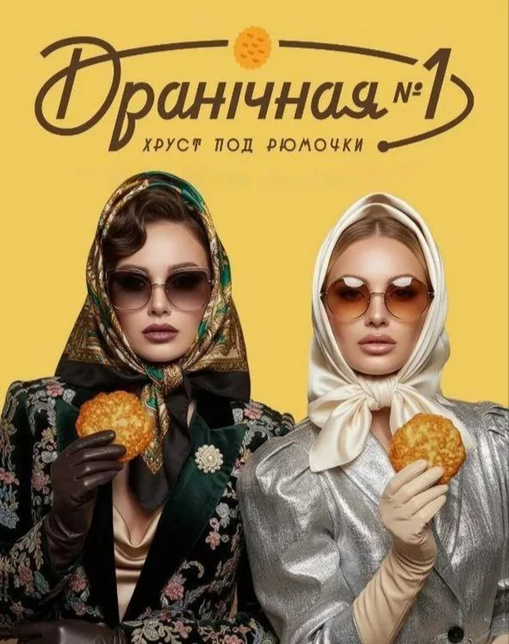 При этом на рекламе ресторана — две гламурные девушки в платочках и очках (у многих белорусов они вызвали ассоциации с девушками с московских Патриков, Патриарших прудов), которые держат в руках по дранику.