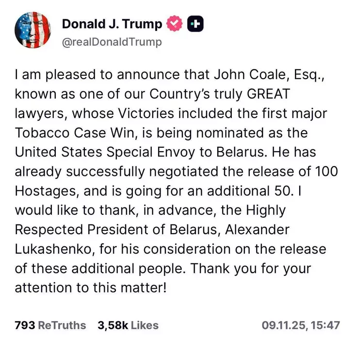 Президент США Дональд Трамп также сообщил в своей социальной сети Truth Social о том, что Джон Коул будет назначен на должность специального посланника Соединенных Штатов в Беларуси.