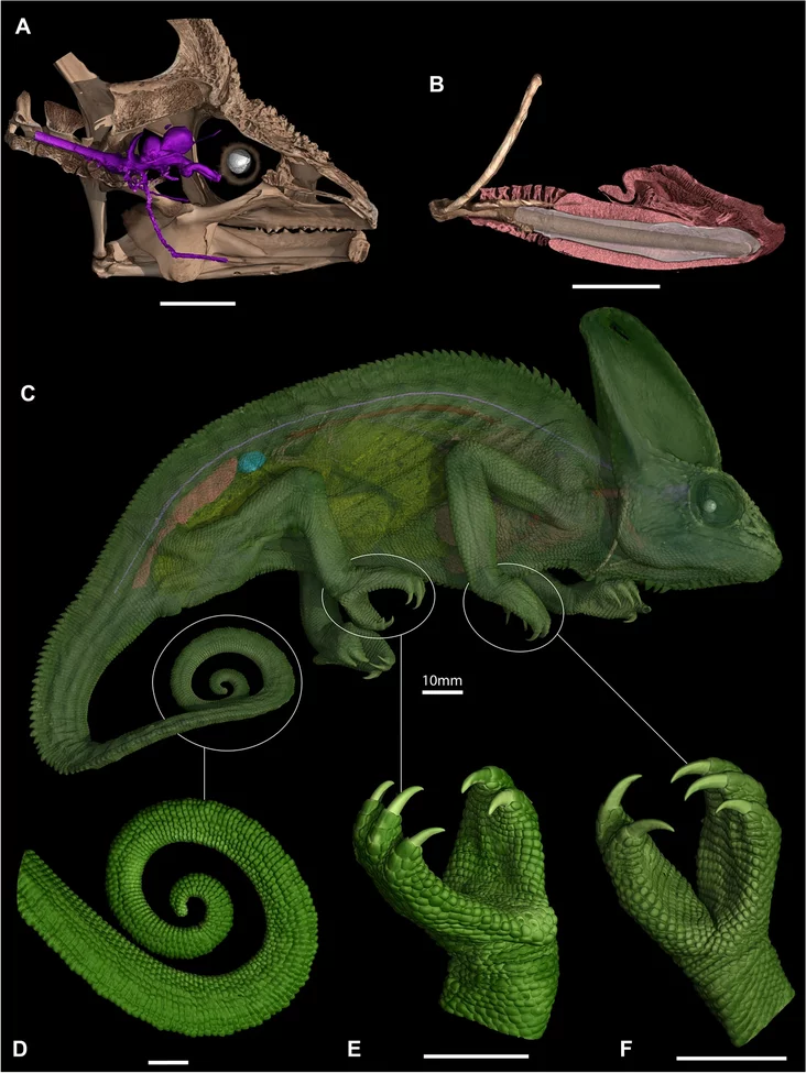 Международная группа ученых изучила 34 вида ящериц, включая три вида хамелеонов — Brookesia superciliaris, Rieppeleon brevicaudatus и Chamaeleo calyptratus. С помощью компьютерной томографии было подтверждено, что зрительные нервы хамелеонов имеют спиральную форму с несколькими изгибами от мозга к глазам. Такая структура дает нервам запас длины и снижает напряжение во время движения глаз.