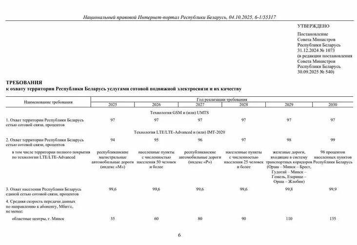 Впрочем, можно предположить, что этот раздел основан на «Требованиях к охвату территории Республики Беларусь услугами сотовой подвижной электросвязи и их качеству», которые Совмин утвердил 30 сентября 2025 года.