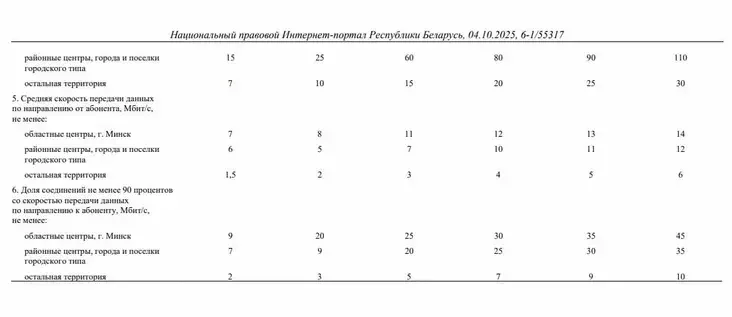• в Минске и областных центрах в 2026 году — не менее 60 Мбит/с, до 2030 года — не менее 135 Мбит/с;
