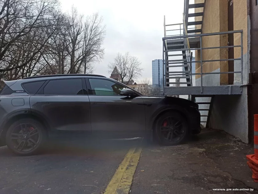 Водитель Voyah просто заехал носом под железобетонную конструкцию лестницы. С большинства ракурсов может показаться, что капоту крышка. Но нет, стоит присмотреться, как становится очевидным: несколько сантиметров запаса еще есть. Но скажите честно: вы бы так рискнули?