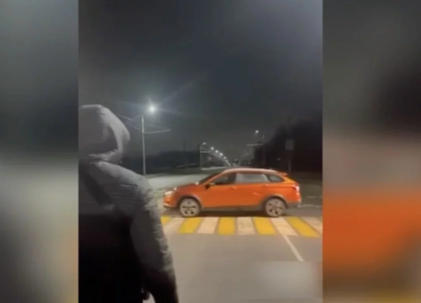 При этом пешеход стоит на проезжей части, давая им преимущество движения. Видео снято ночью.