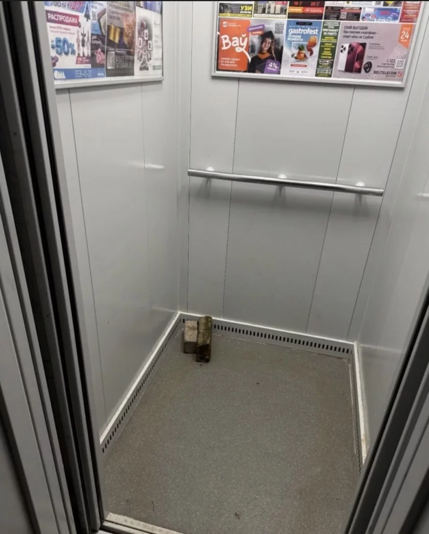 Неожиданную картину увидела в жилом доме в Могилёве девушка: двери вызванного лифта открылись, а на полу лежали два кирпича. Оказалось, что это не хулиганство, а необходимость.