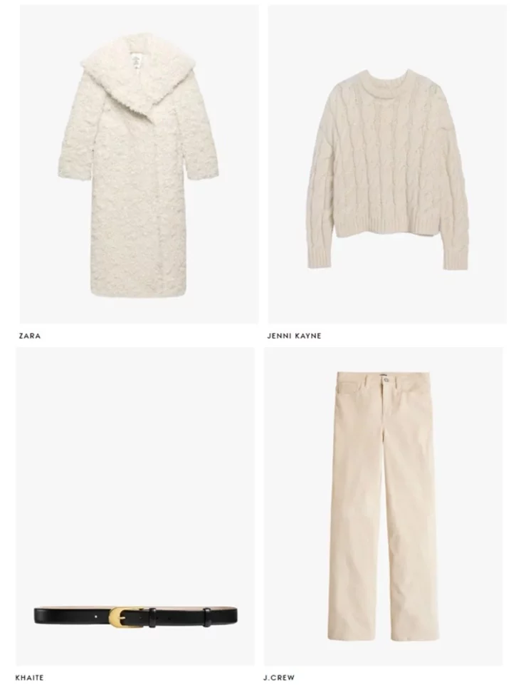 Как носить: сочетайте белые вельветовые брюки с объемным свитером крупной вязки. Сверху накиньте меховую куртку или пальто в тон. А чтобы добавить света — немного золота в аксессуарах.