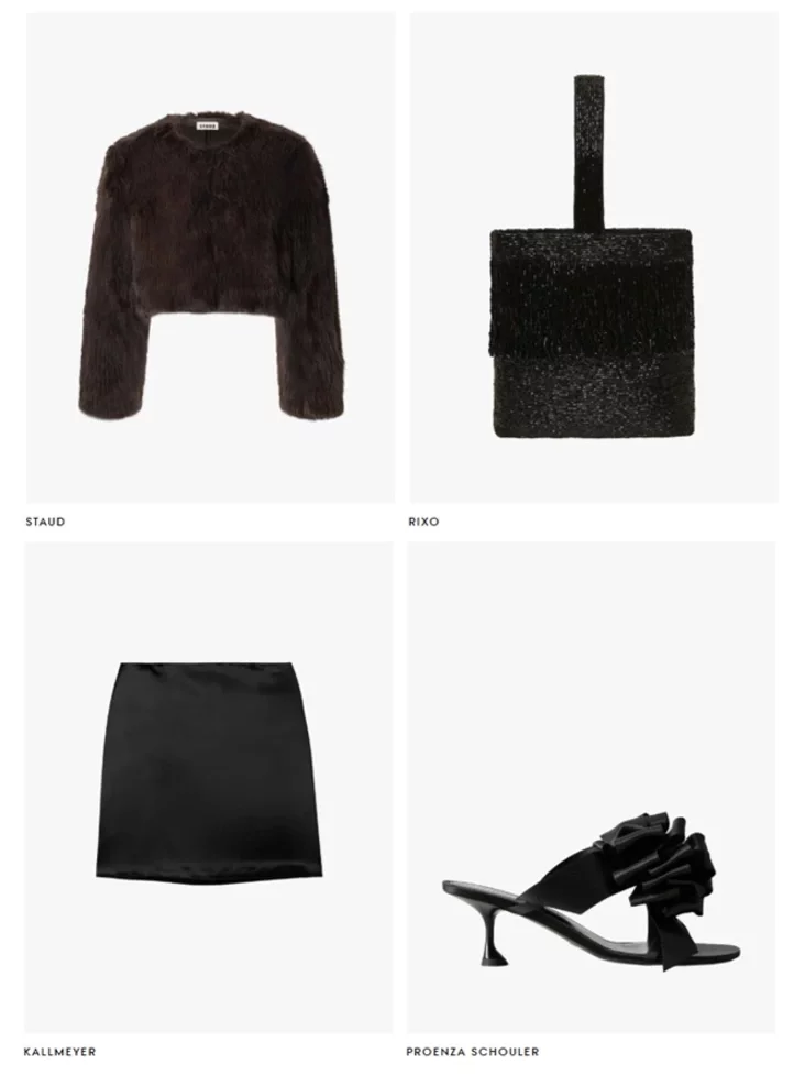 Короткая куртка из искусственного меха хорошо сочетается с атласной мини-юбкой. Добавьте небольшую сумку с металлическим блеском и элегантные туфли или мюли — получите образ «праздник здесь и сейчас», но без излишеств.