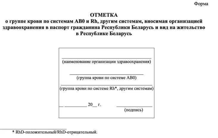 Информация о группе крови будет вноситься в паспорт гражданина Беларуси и разрешения на жительство в нашей стране по системам АВ0 и Rh, а также по другим.
