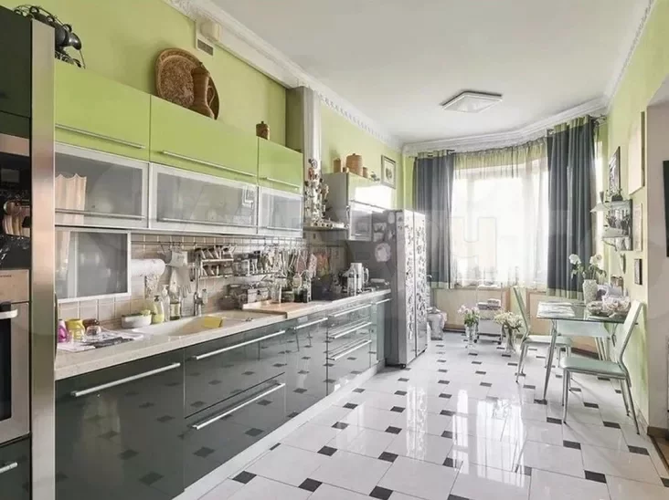 Просторная кухня в оливково-изумрудных оттенках объединена с гостиной. Общая площадь их составляет около 50 квадратных метров, пол выложен натуральным паркетом.