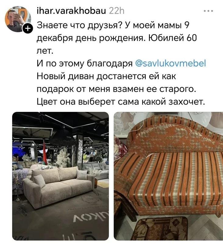 Золотым дождём на Игоря посыпались и подарки от брендов. Например, витебская фабрика мебели «Савлуков-Мебель» подарила ему диван для матери, которая скоро будет праздновать юбилей. В комментариях уже интересуются, за сколько можно приобрести диван, на котором посидел Игорь.