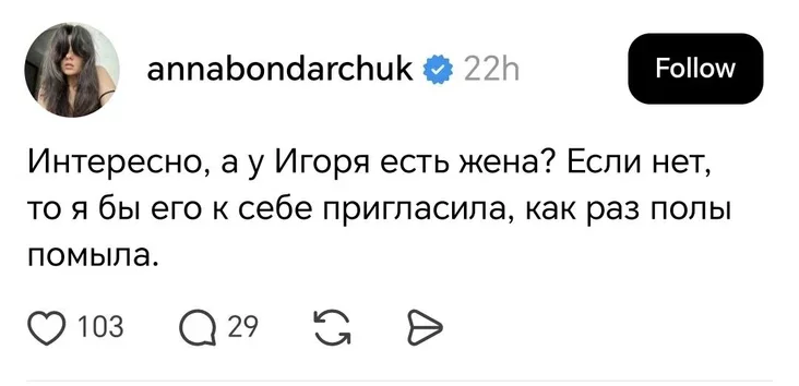 Заинтересовалась заводчанином из Витебска и блогерша Анна Бонд: «Интересно, а есть ли у Игоря жена? Если нет, я бы пригласила его к себе, я как раз полы помыла». Позже она действительно позвала Игоря (который не женат) к себе в гости в Дрозды. Но, справедливости ради, у парня сейчас не менее жёсткий кастинг, чем на «Мисс Беларусь».