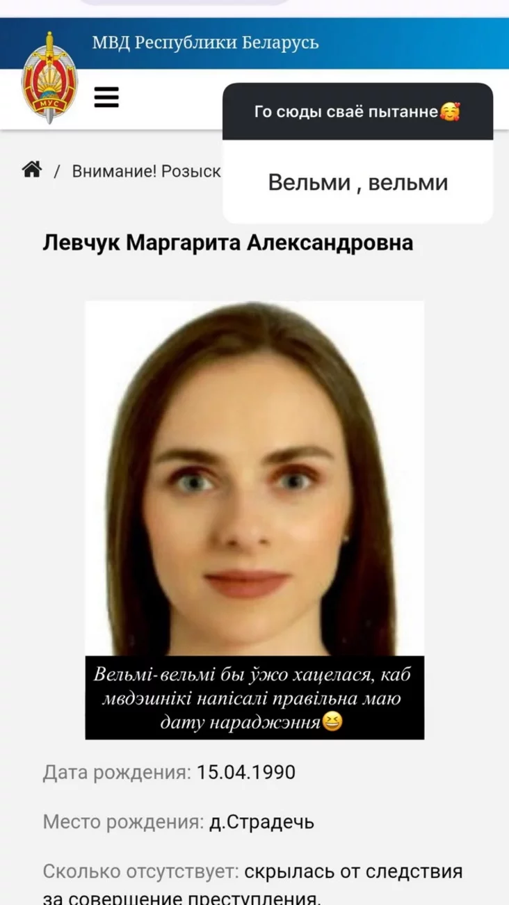 О том, что фото Маргариты Левчук теперь можно увидеть на стендах «Их разыскивает милиция» в Беларуси, сообщила сама певица на своей странице в инстаграме.