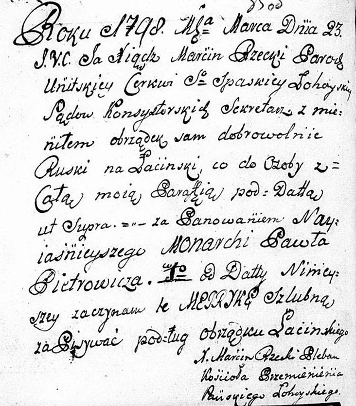 Священник Спасской церкви в Логойске Мартин Рецкий 23 марта 1798 года честно написал, что он теперь римско-католический ксендз, а его прихожане теперь римо-католики.