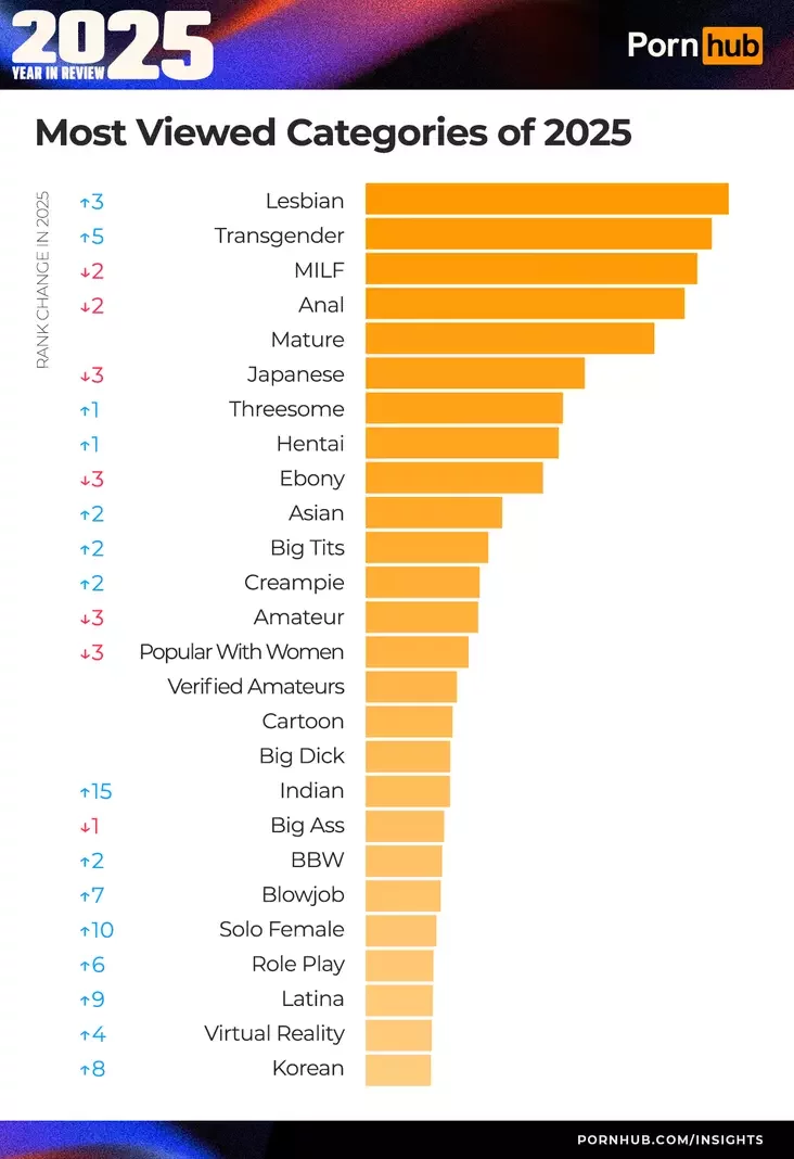 Лидером в мировом рейтинге стала категория «Лесбиянки» (Lesbian). По сравнению с прошлым годом она поднялась сразу на три позиции. А вот прошлогодний фаворит — видео с «милфами» (женщинами 33—44 лет) — опустился на третье место.