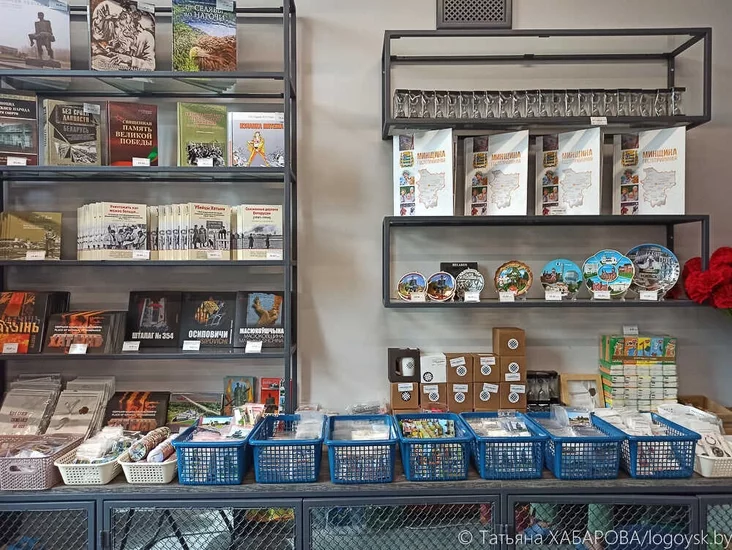 Ассортимент в сувенирном магазине представляет собой замысловатый микс. С одной стороны — книги про войну и значки с изображениями мемориала. С другой — типичный набор белорусских сувениров, которая не соответствует траурному контексту места.