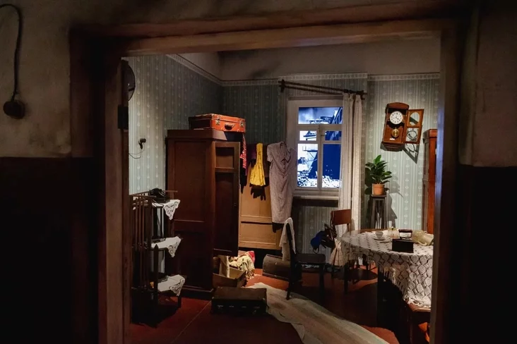 Экспозиция начинается с зала «Бегство от войны». Здесь создан интерьер заброшенной квартиры с разбросанными вещами, где телефонный звонок обрывается звуком взрыва. Один из самых жутких элементов — зеркало, в котором появляется призрачное изображение трехлетней девочки. Голограмма рассказывает историю ребенка, который попал в немецкий детский дом, где из него выкачивали кровь для раненых солдат вермахта.