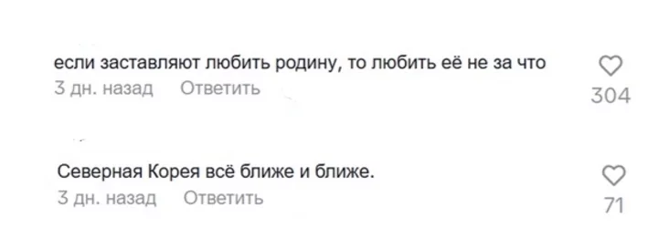 «Если заставляют любить родину, то любить ее не за что», — выражает свое мнение зритель и находит массовую поддержку других.