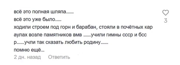 «Все это полная шляпа… все это уже было… ходили строем под горн и барабан, стояли в почетных караулах у памятников Второй мировой… учили гимны СССР и БССР… учили, так сказать, любить родину… помню еще».