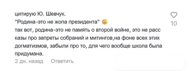 «Цитирую Юрия Шевчука: «Родина — это не жопа президента». Так вот, родина — это не память о Второй войне, это не рассказы про запреты собраний и митингов. На фоне всех этих догматизмов забыли о том, для чего вообще школа была придумана».