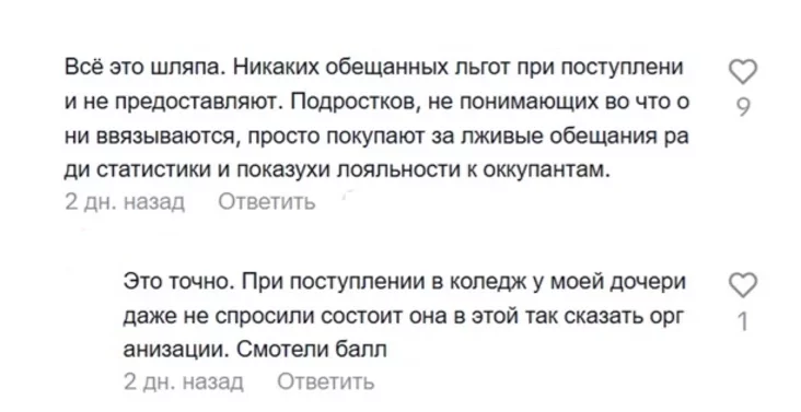 «Все это шляпа. Никаких обещанных льгот при поступлении не предоставляют. Подростков, не понимающих, во что они ввязываются, просто покупают за лживые обещания ради статистики и показухи лояльности к оккупантам».