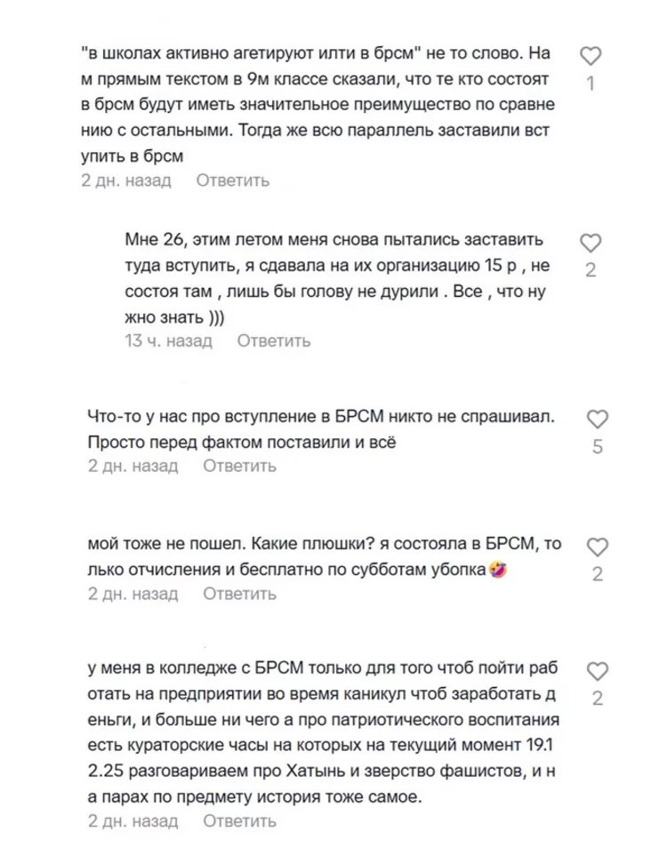 «У меня в колледже в БРСМ идут только для того, чтобы пойти работать на предприятие во время каникул, чтобы заработать деньги, и больше ничего. А про патриотическое воспитание — есть кураторские часы, на которых на текущий момент, 19.12.25, разговариваем про Хатынь и зверства фашистов, и на парах истории то же самое».