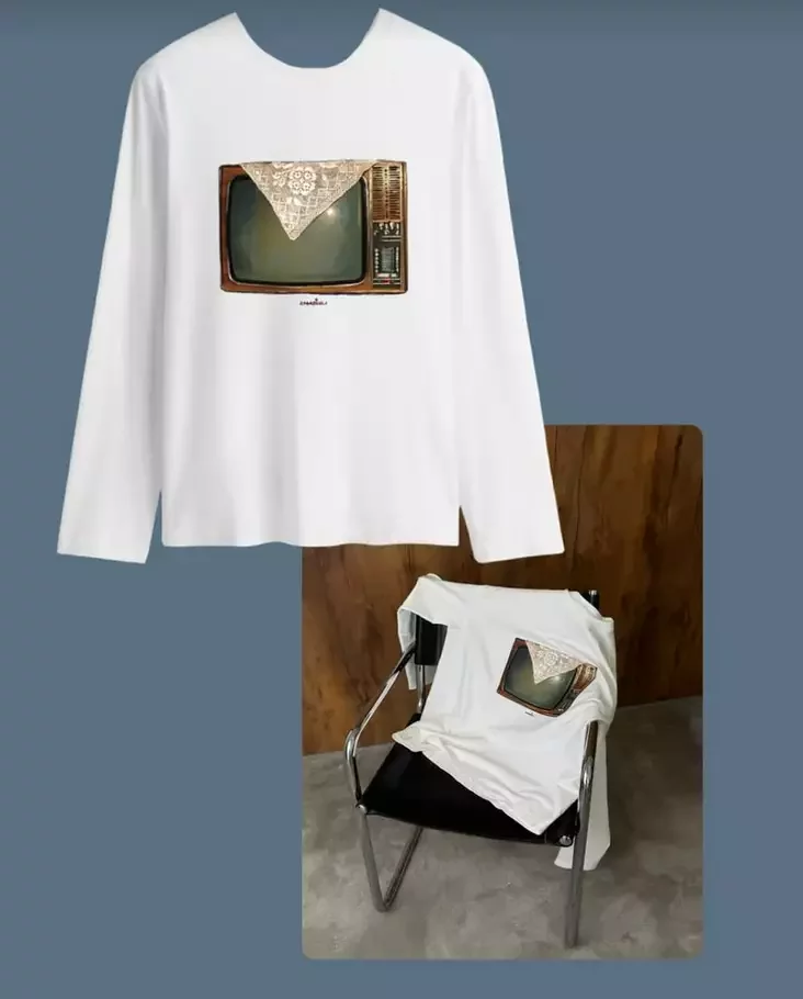 Дизайнеры же из ZABRODSKI подготовили для вас целую серию лонгсливов на любой вкус — с культовой белорусской едой, бабушкиным телевизором, накрытым салфеткой, или тем самым деревенским сервантом с сервизом.
