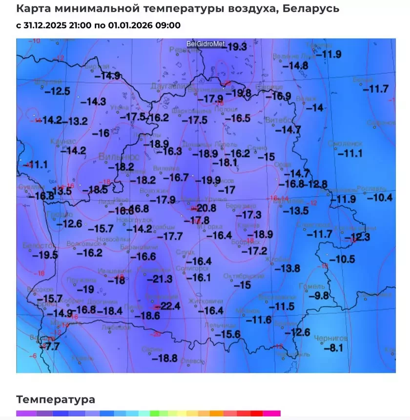 В Вильнюсе было минус 18, в обычно теплом Бресте — минус 15, в Гродно — минус 13, в Могилеве и Витебске — минус 14, а в Гомеле — всего лишь минус 10.