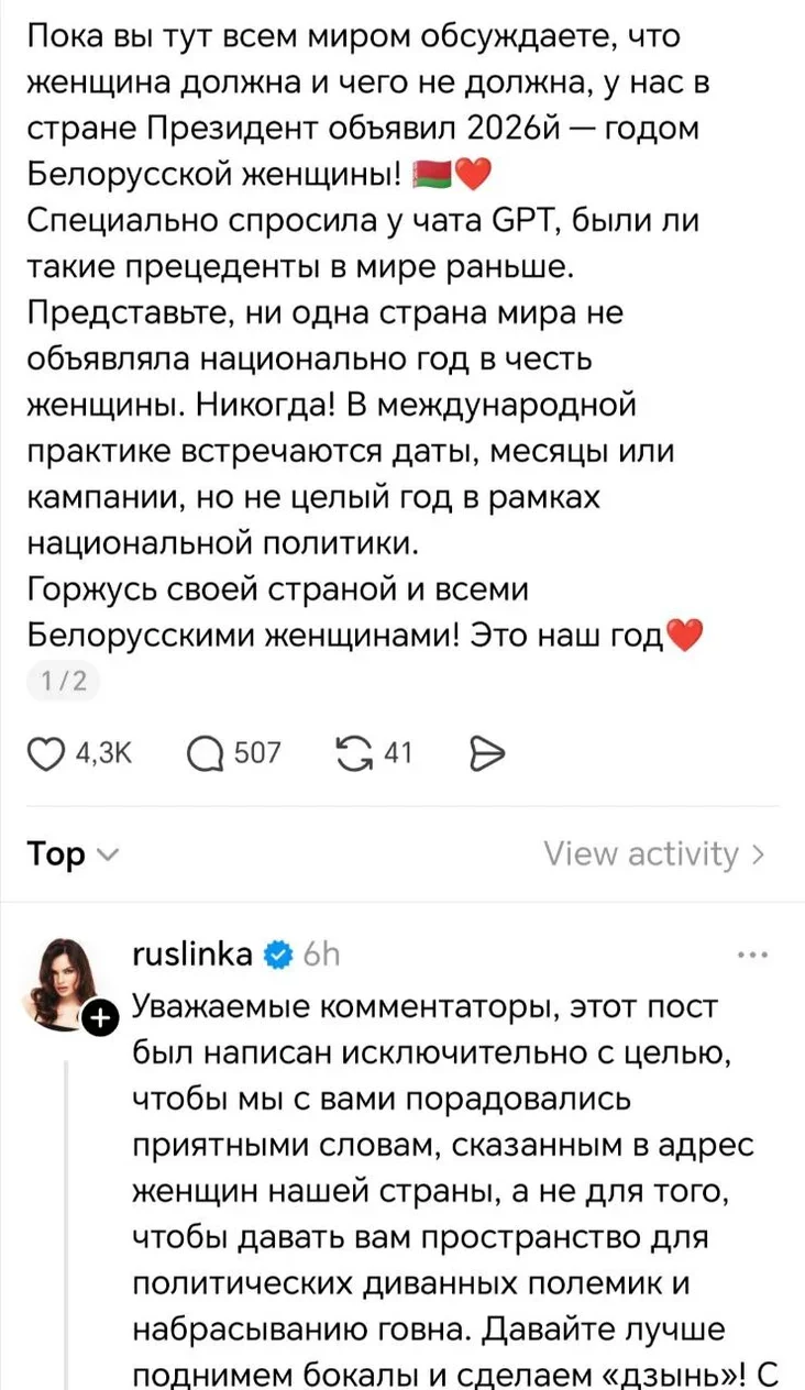 А вот в Threads к раскрутке темы подошли более основательно. Совпадение или нет, но и здесь во многих случаях решение Лукашенко нахваливают девушки, которые участвуют в разных конкурсах красоты — например, лайф-коуч Наталья Кивачук, которая в 2025 году получила титул мисс Viva Braslav.