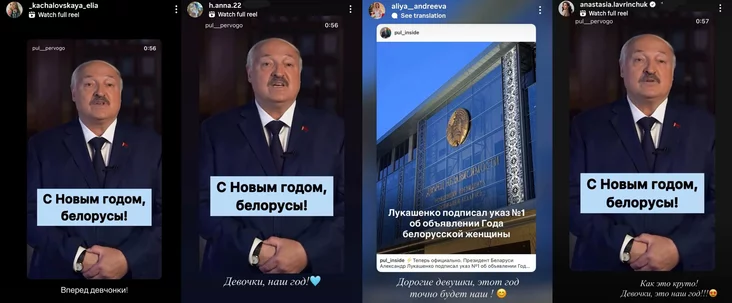 Как по команде на новость отреагировали девушки, которые в разные годы участвовали в конкурсе «Мисс Беларусь». В сторис они репостили видео, в котором Лукашенко поздравляет с Новым годом, и подписывали вроде: «Девушки, этот год точно будет наш!».