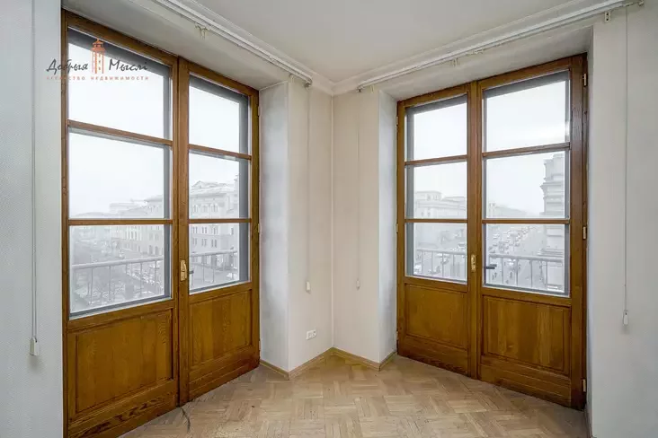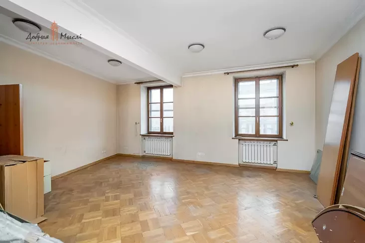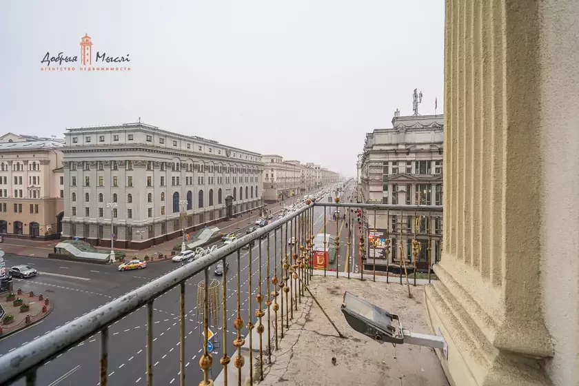 Высота потолков — 3,1 метра. Но, пожалуй, главная уникальность этой квартиры в том, что она находится на четвертом этаже, который единственный в доме, где есть балконы. Особой ценности добавляет тот факт, что квартира угловая, поэтому балкон здесь большой и выходит сразу на проспект Независимости и улицу Ленина.