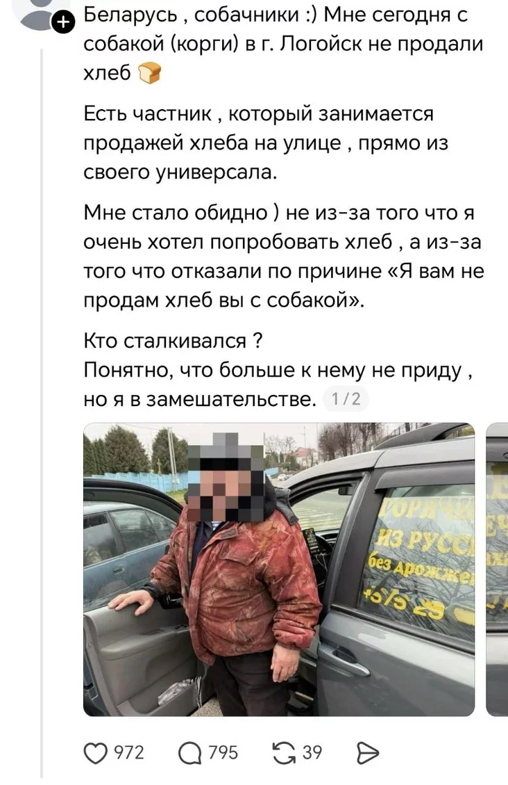 В аналогичную ситуацию в декабре попал и Вадим, который попытался купить у Дяди Миши хлеб, когда шел из кафе со своим корги: «Есть частник, который занимается продажей хлеба прямо из своего универсала. Мне стало обидно. Не из-за того, что я очень хотел попробовать хлеб, а из-за того, что мне отказались его продать по причине: «Я вам не продам хлеб, вы с собакой».