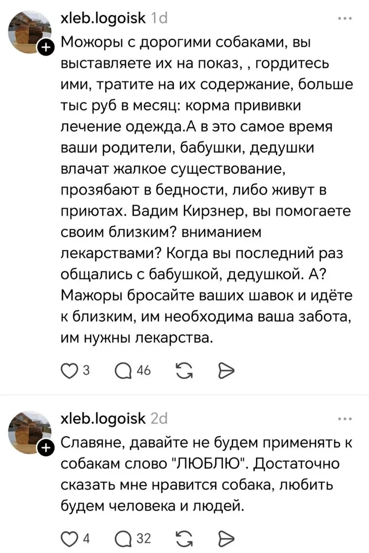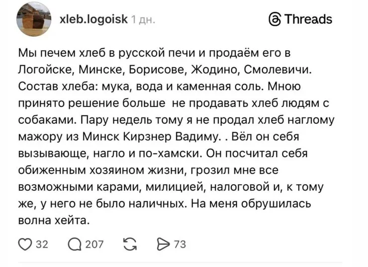Но недавно Дядя Миша попал в скандал из-за своей клинической нелюбви к собакам. В его Threads появилось предупреждение: мужчина говорит, что принципиально не будет продавать свой хлеб собачникам. Утверждает, будто бы он дал такое слово своим «адекватным покупателям».