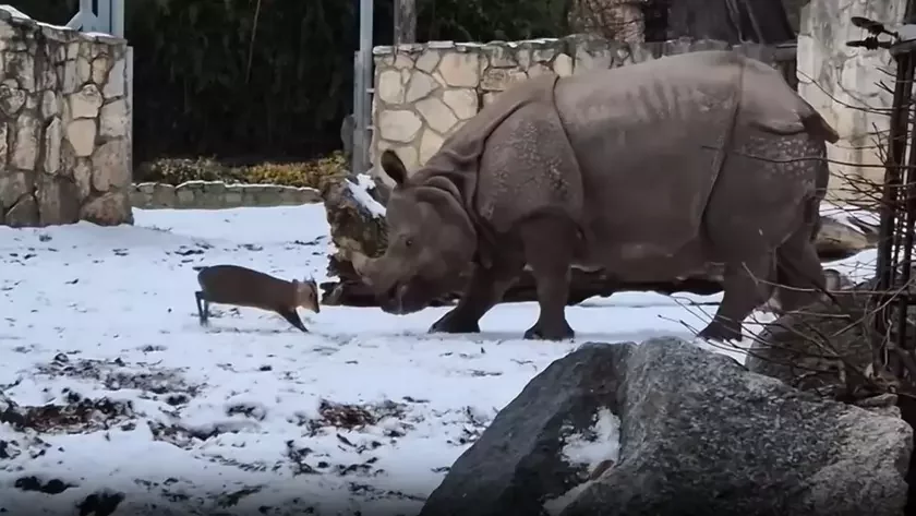 Во Вроцлавском зоопарке маленький олень напал на огромного носорога ВИДЕО