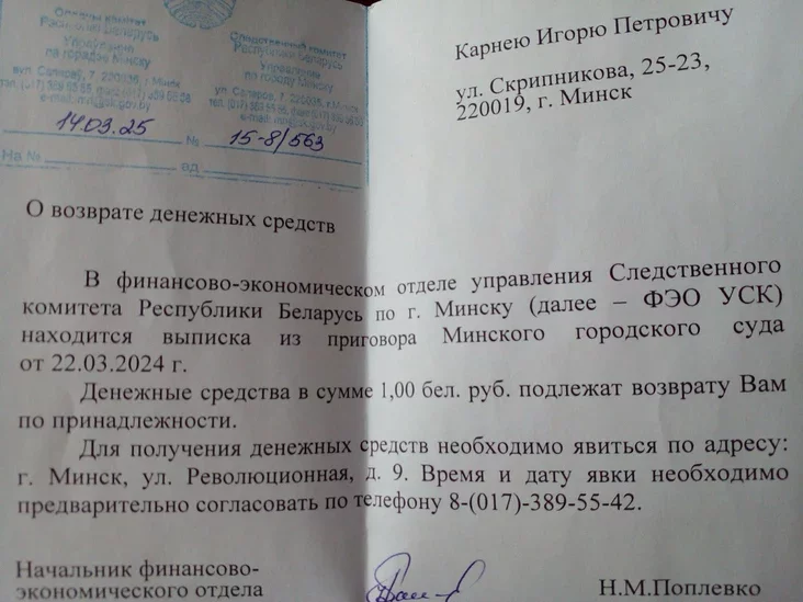 «Следственный комитет приглашает в свое минское управление, чтобы я мог забрать по ведомости… 1 рубль. Нет, никакая не описка: не 1000, не 100 и даже не 10. А именно 1», — написал Игорь Карней в своем фейсбуке.