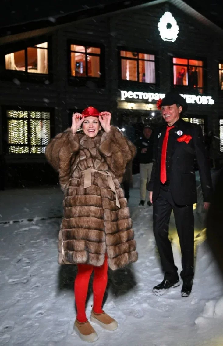 Сама же Ольга надела чёрное бархатное мини-платье с глубоким декольте, добавила кокошник и массивные колье. Вадим выбрал образ зазывалы с ярмарки, который созывает публику в балаган. Он появился на мероприятии в чёрном костюме с контрастным красным галстуком и в картузе с цветком.