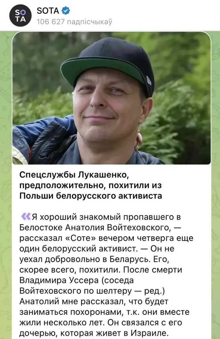 Перед этим Анатолий Войтеховский, которого в 2023 году эвакуировал «Байсол» из-за политического уголовного преследования, написал в комиссию по возвращению. Он вывез из Польши документы по уголовному делу своего умершего соседа-шпиона Владимира Уссера.