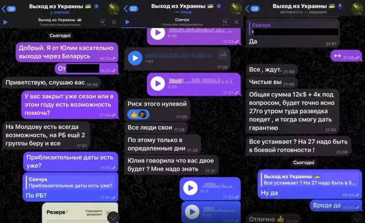Журналист БРЦ пообщался с представителем одной из таких групп в Telegram. Тот предложил купить проверенный маршрут побега из Украины либо оплатить услугу «под ключ»: заказать авто с опытным водителем, который объедет блок-посты в Украине и привезет к границе, когда на белорусской стороне будет дежурить «своя смена» пограничников. За помощь в нелегальном выезде для двоих мужчин собеседник запросил $16 тыс. Эта стоимость включает организацию побега в Беларусь, а потом — в ЕС.