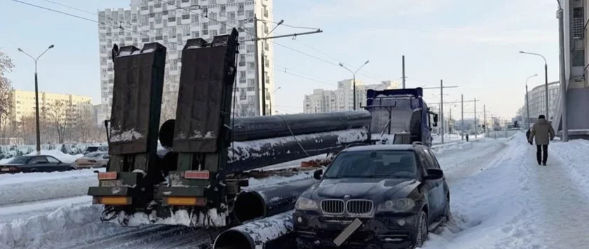 Кстати, обратите внимание: трубы перевозились не на грузовой платформе, а на трале, предназначенном для перевозки спецтехники. На фото виден то ли трос, то ли канат, с помощью которого, похоже, пытались зафиксировать груз. Но этого, очевидно, оказалось недостаточно.