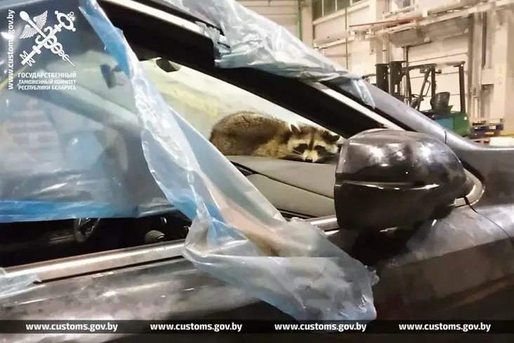 Енот приплыл в Беларусь из США в морском контейнере с легковыми машинами. Когда его заметили, то сначала приняли за игрушку. В дороге енот провел не меньше месяца. С голоду даже погрыз салон машины.