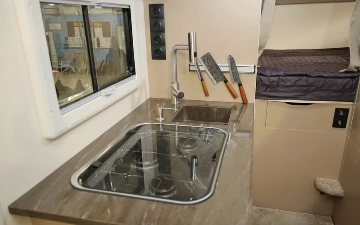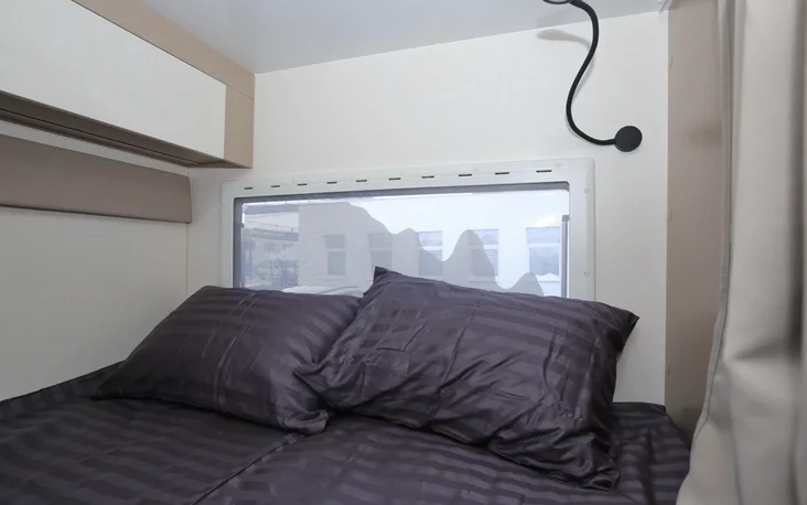 Внутри — достаточно пространства, отделка и мебель из экокожи в светлых тонах, панорамные окна. Автодом рассчитан на семью из четырех человек.