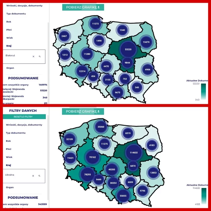 По состоянию на начало 2026 года в Польше живут 140 974 гражданина Беларуси с разрешениями на жительство всех типов, а украинцев — 543 599 человек.