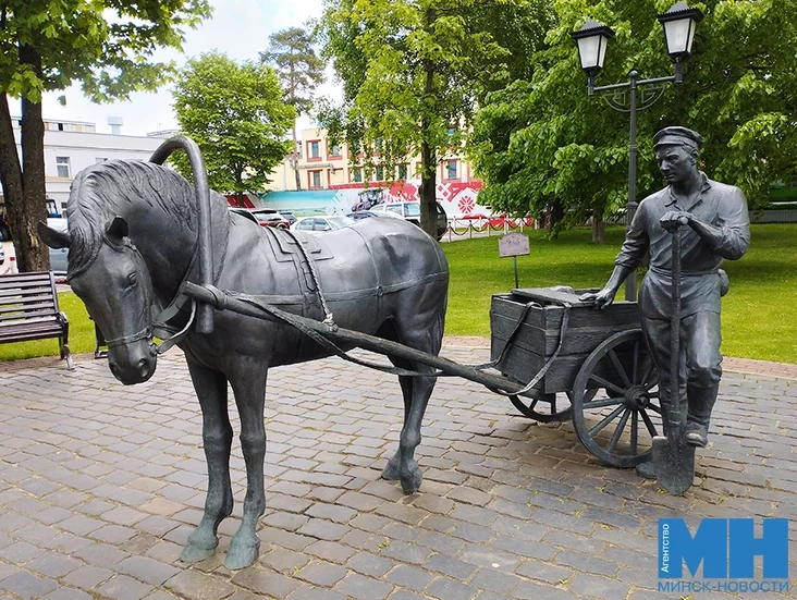 Еще одного коня можно увидеть в сквере «70 лет МТЗ». Рядом с верной помощницей находится грабарь с лопатой.