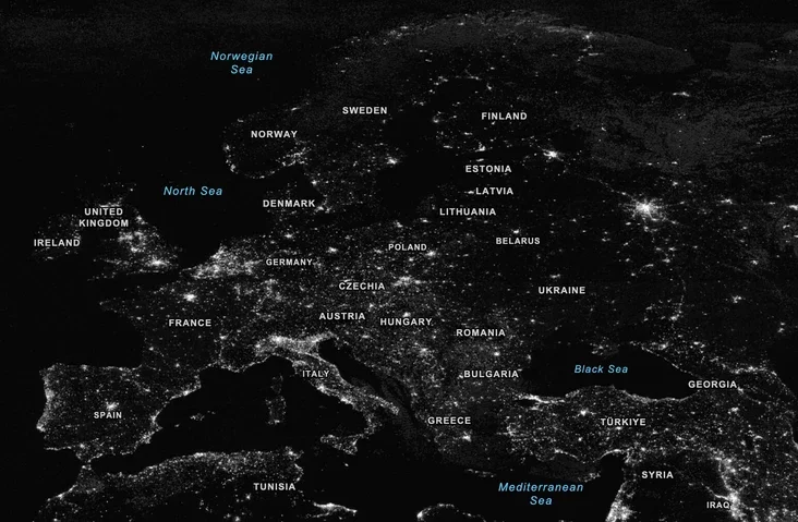 Здесь видно, что Беларусь в целом на фоне Западной Европы подсвечена довольно слабо, особенно в сравнении с Италией или Турцией.