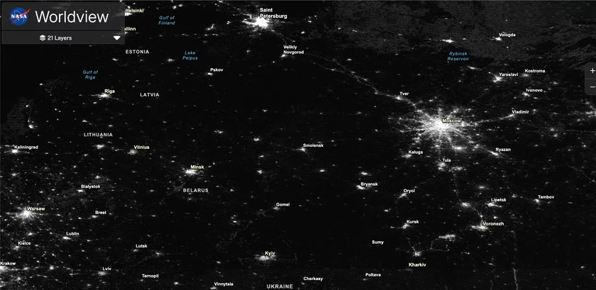 На ночных снимках из космоса видно, что Минск освещен ярче, чем Вильнюс, но менее ярко, чем Варшава и, особенно, Москва.