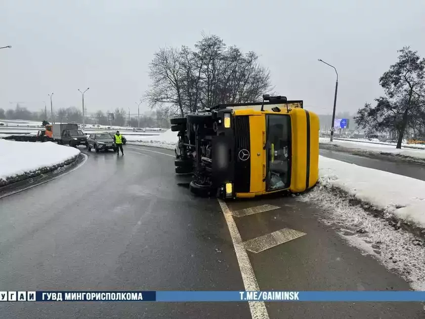 В Минске на Партизанском проспекте произошло необычное дорожно-транспортное происшествие — грузовик Mercedes перевернулся без какого-либо участия других автомобилей.