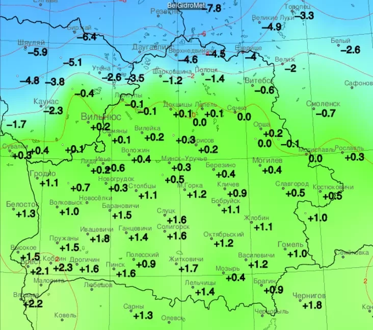 В Верхнедвинске было минус 4,6°С, Езерище — минус четыре, в Браславском районе — -3,5°С, Полоцке — -1,4°С, Шарковщине — -1,2°С, Витебске — -0,6°С, Лынтупах — -0,1°С. И, вероятно, в Дрибинском районе Могилевской области — -0,1°С.