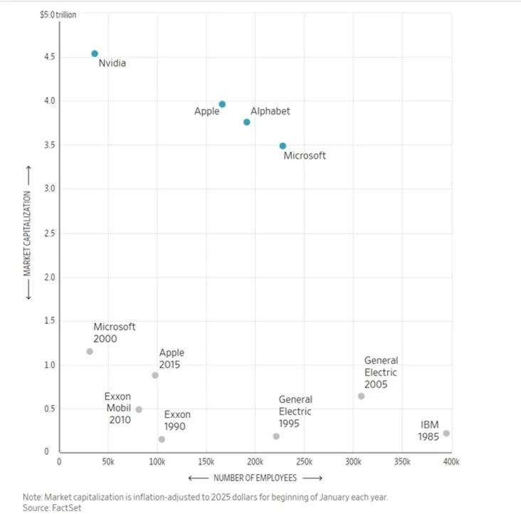 Чтобы понять, насколько радикально изменилась мировая экономика за последние десятилетия, достаточно взглянуть на две знаковые корпорации разных эпох. В 1985 году IBM была самой дорогой и прибыльной компанией США, обеспечивая работой почти 400 000 человек. Сегодняшняя Nvidia стоит в 20 раз больше и в пять раз более прибыльна (с поправкой на инфляцию), но в ней работает всего десятая часть от тогдашнего штата IBM, пишет The Wall Street Journal.
