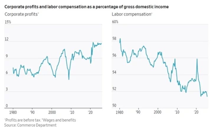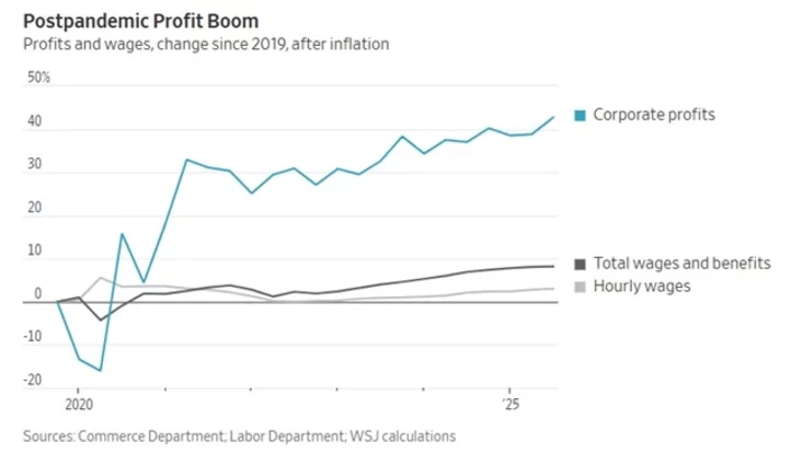 Ситуация обострилась после пандемии Covid-19. Хотя краткосрочный дефицит кадров вынудил работодателей поднять зарплаты, инфляция съела большую часть этого прироста. С конца 2019 года реальные почасовые зарплаты (после учёта инфляции) выросли всего на 3%, а совокупная оплата труда — на 8%. В то же время корпоративные прибыли взлетели на колоссальные 43%.