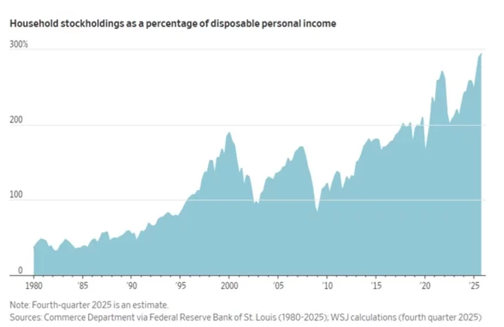 Эта динамика привела к тому, что благосостояние наиболее состоятельных слоёв населения теперь зависит не от зарплат, а от фондового рынка. Богатство домашних хозяйств, размещённое в акциях, теперь составляет почти 300% от их годового располагаемого дохода (против 200% в 2019 году).