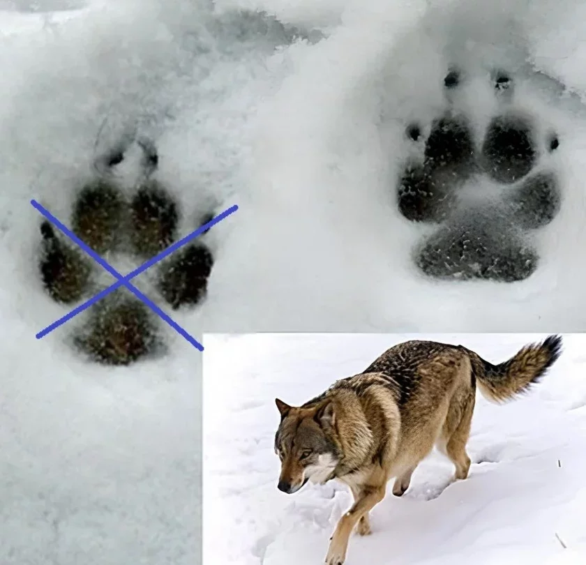 Следы волков обычно имеют длину 8—12 см в длину и более овальную (вытянутую) форму, в то время как следы собак более круглые и рыхлые.