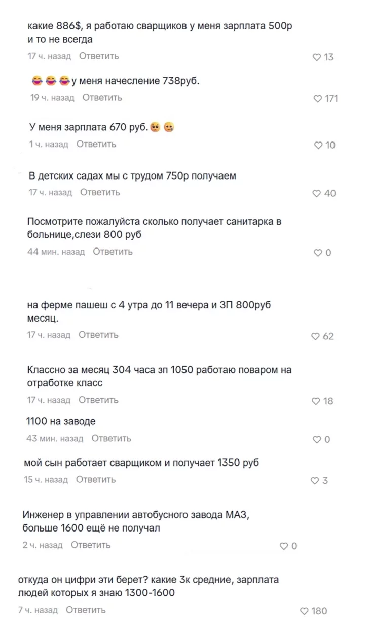 «Так она растет по припискам, а реально зп 900—1300, и то до вычета налогов», — считает еще один комментатор, и его мнение разделяет почти тысяча других людей.